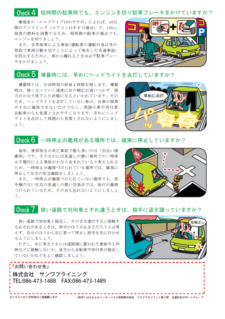 事故防止の取組として、安全運転のポイントをご案内しております。 2025年12月号は『安全運転をより一層推進するためのステップとなるチェックポイント』です。 安全運転を継続していくためには、自分の運転を振り返り、交通ルールを守っているか、安全運転の基本を実践しているかなどをチェックすることが大切です。 年末年始は買い物や帰省などで車を利用する機会が増える時期です。 『安全運転のポイント』でチェックポイントを確認し、この機会に自分の運転を振り返ってみましょう。
